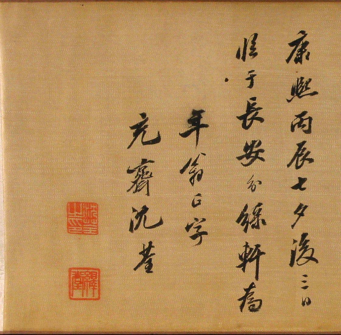 康熙丙辰七夕后三日,临于长安分绿轩,为年翁正字。充斋沈荃。