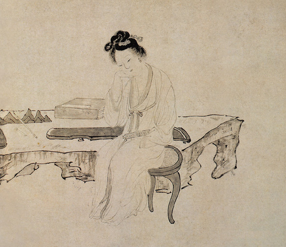 武陵春是江南名妓,原名齐慧贞,传说她与傅生相爱五年,后傅生获罪被徙,慧贞倾其资财营救不得,竟忧郁成疾而死。吴伟同时代的金陵著名文士兼画家徐霖写小传歌颂她,吴伟便据此画了这幅画。画面中,武陵春一手托腮,一手执卷,沉浸在哀惋不平的诗思之中。在背景中有一石案,一疏梅,在案上是琴、书、笔、砚。这些陈设是为了说明武陵春多才多艺,喜读书,能诗文,且善于鼓琴,并能谱曲。