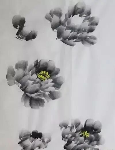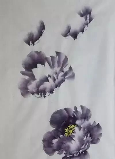 用粉调墨法:调粉后将笔尖的白粉洗去,蘸墨调和,笔尖略浓。使墨与粉自然融和渗化,自然过渡。墨色很灵敏,画牡丹的前几笔宜干些,容易留出飞白。点花时笔触不能过多的叠压,避免画脏,无笔痕。笔上水份多时画大花瓣,水份少时画小花瓣或提层次。花形大概画完后,用笔尖调浓墨刻画局部和花心部位,使其更加丰满厚重。(如图五)