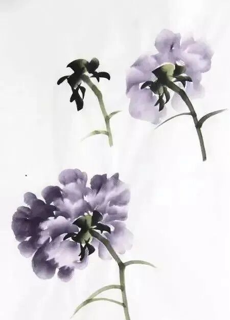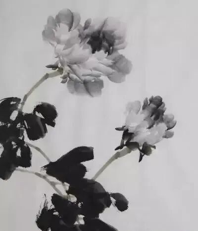 清水调墨法:在生宣纸上用水要充分掌握其性能的变化,使其能渗化自然、顺势而发。用水调淡墨,笔尖略浓。调和后,笔略干,水份不宜太多。看准位置,用侧锋大胆落墨。行笔要快、有节奏,画上四五笔亮部,留飞白。由前向后逐步画。注意花头的透视关系,再蘸墨依次画完花头即可。画外轮廓时笔触要大、要稳、准、狠,花心要略浓一些。画前应成竹在胸,花淡叶浓,花浓叶淡,反差要大,对比要强。最后调色画花托。(如图四)