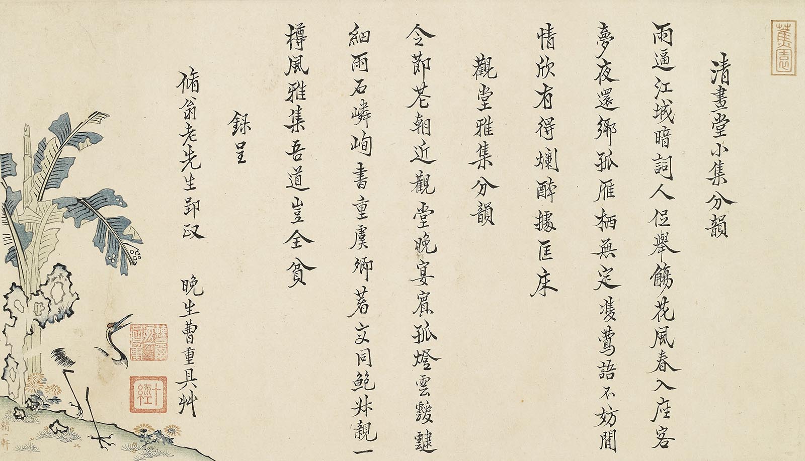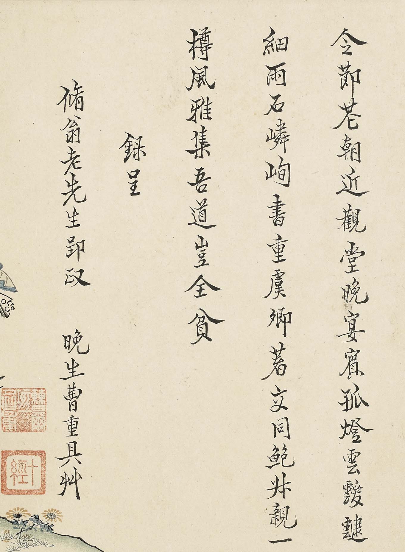 觀堂雅集分韻。令節花朝近,觀堂晚宴賓。孤燈雲靉靆,細雨石嶙峋。書重虞卿著,交同鮑叔親。一樽風雅集,吾道豈全貧。錄呈脩翁老先生郢政。晚生曹重具草。