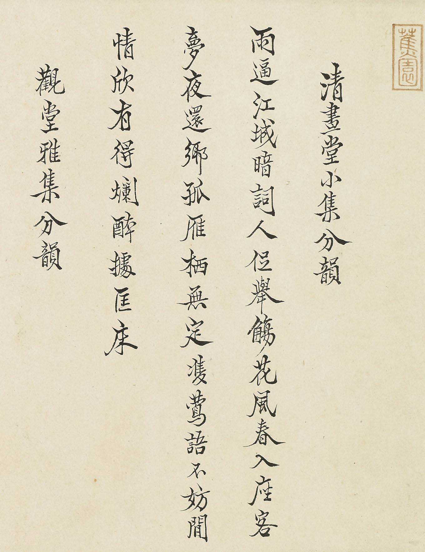 釋文:清晝堂小集分韻。兩逼江城暗,詞人促舉觴。花風春入座,客夢夜還鄉。孤雁栖無定,雙鶯語不妨。閒情欣有得,爛醉據匡床。