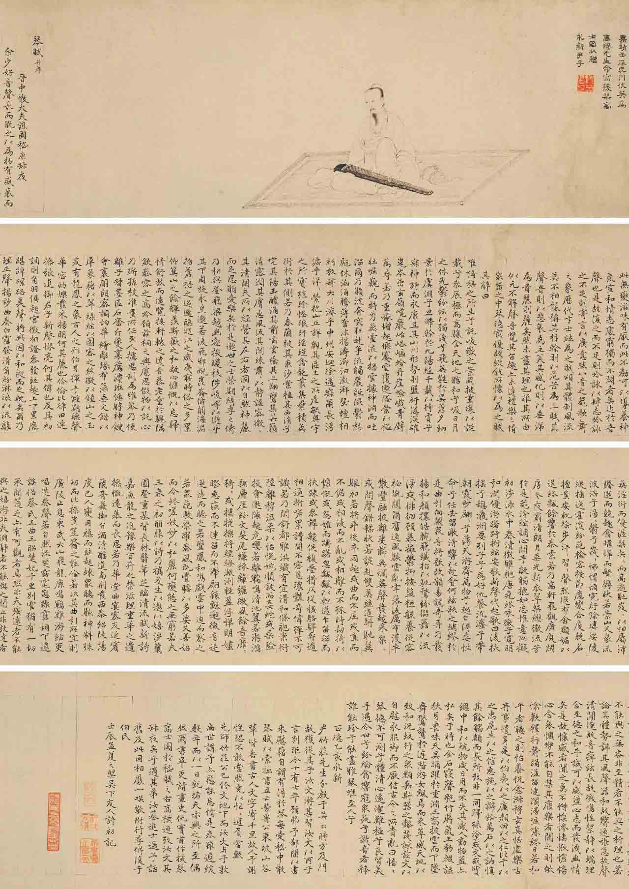 许初题仇英画《援琴高士图并琴赋》卷,水墨纸本,24×266cm。来源:保利二十周年秋季庆典。